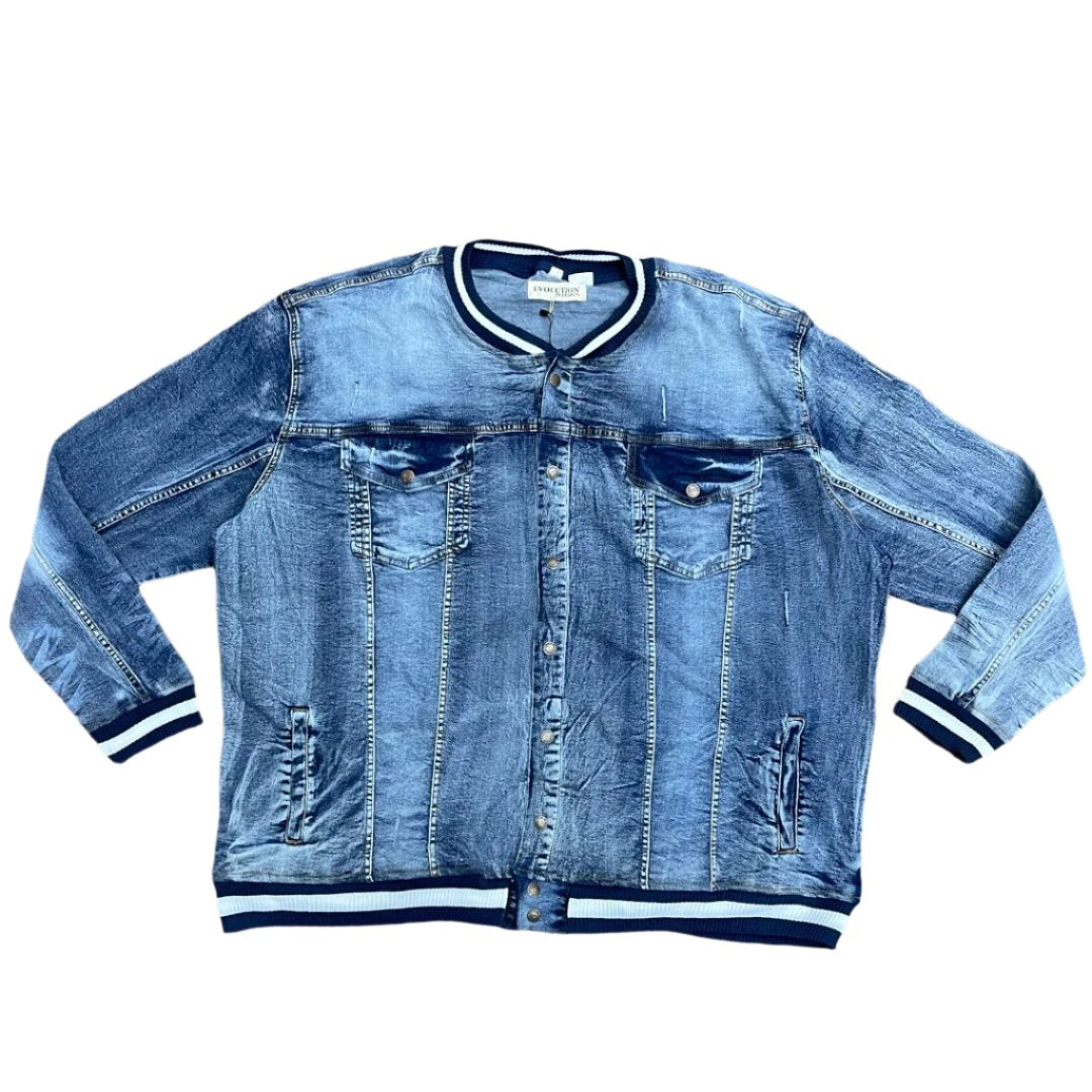 Denim blue jacket with baseball stripe collar